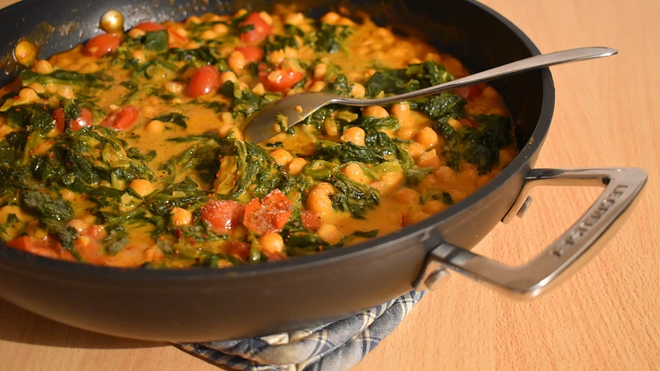 In einer hohen Pfanne das Kokosöl erhitzen. Zwiebel, Knoblauch und Ingwer hineingeben und glasig dünsten. Spinat, Tomaten und Kokosmilch (inkl. dem Wasser) hineingeben und nach Bedarf würzen, einmal gut umrühren und zudecken. Alles bei schwacher Hitze, leicht blubbernd ca. 10 Min. köcheln lassen.